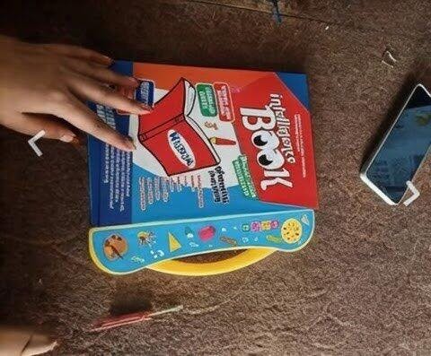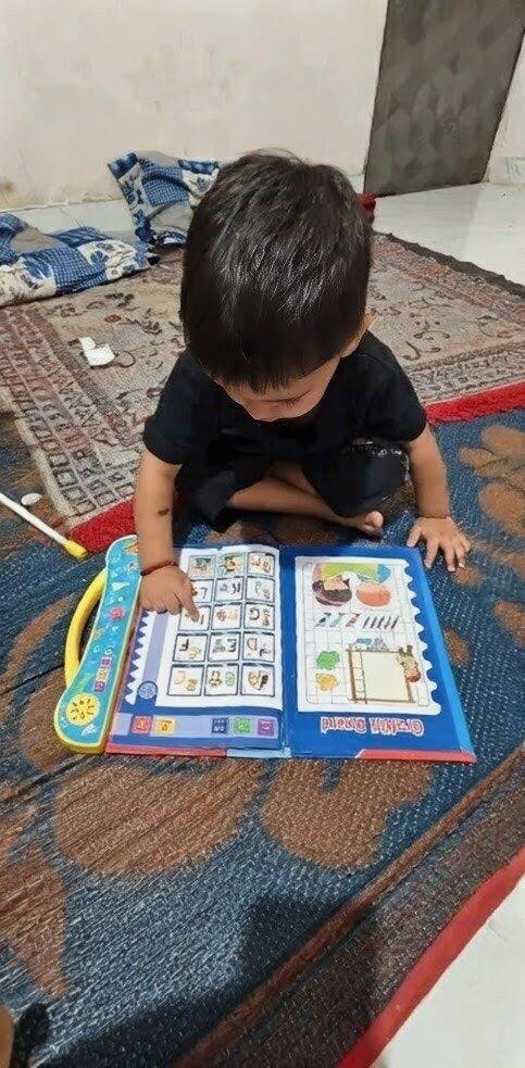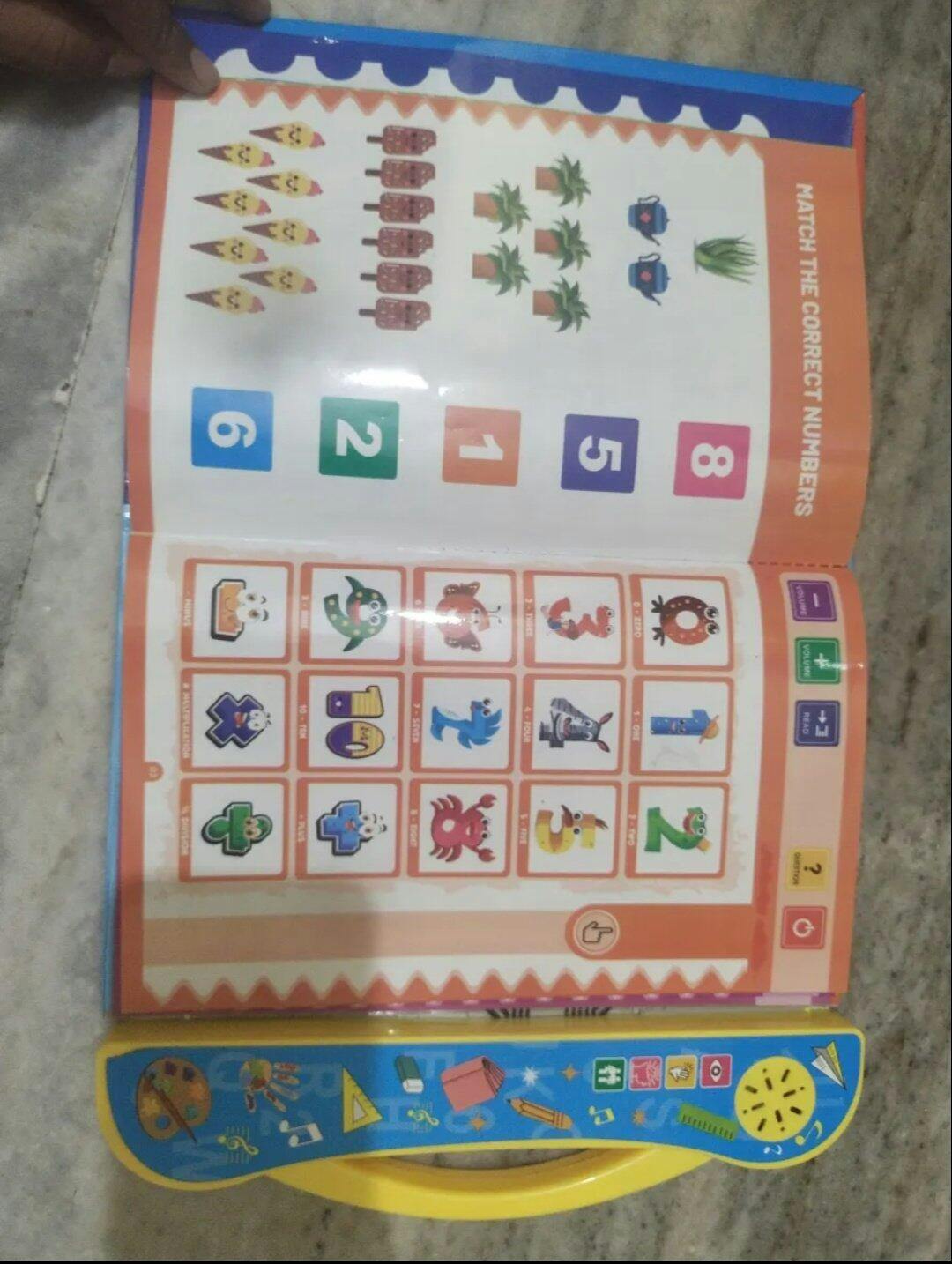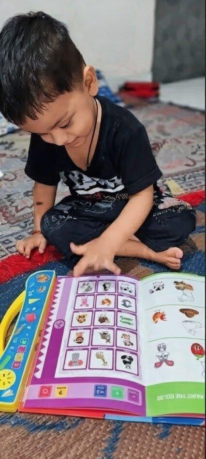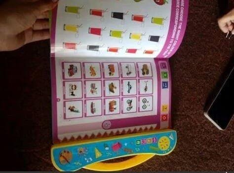 The book has buttons & touch features. When the child presses a button, the book plays sounds, spellings, songs, or information.